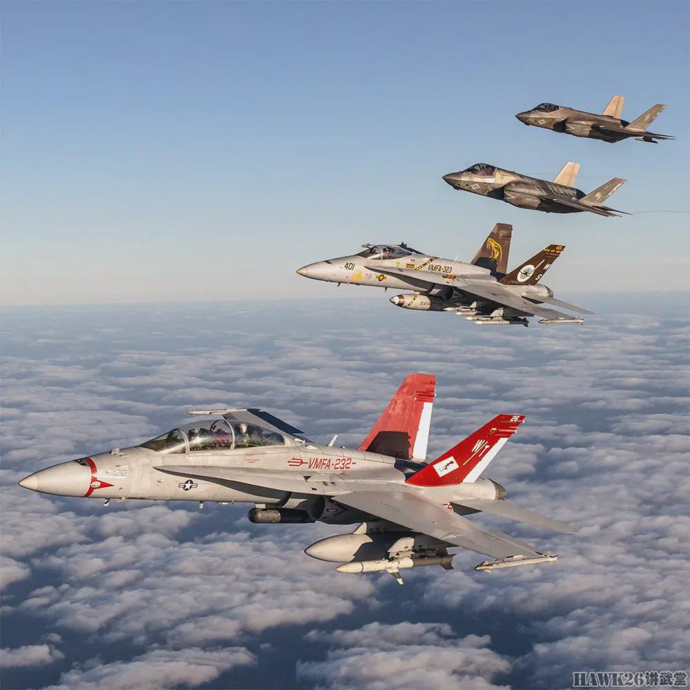 隶属美国海军陆战队第3航空联队第11航空大队的F/A-18C/D“大黄蜂”和F-35B“闪电II”战斗机,在加利福尼亚州圣地亚哥海岸附近混合编队飞行,这是“传承计划(Project Legacy)”的一部分。