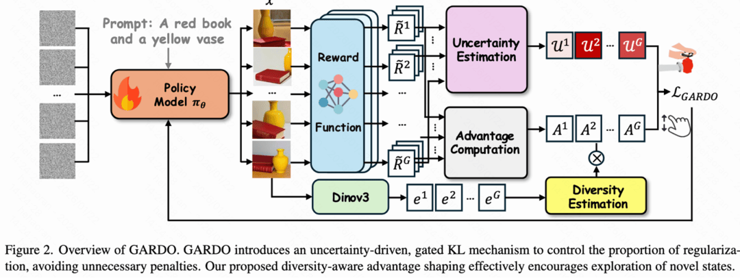 为了打破上述困境,作者提出了GARDO (Gated and Adaptive Regularization with Diversity-aware Optimization) 框架