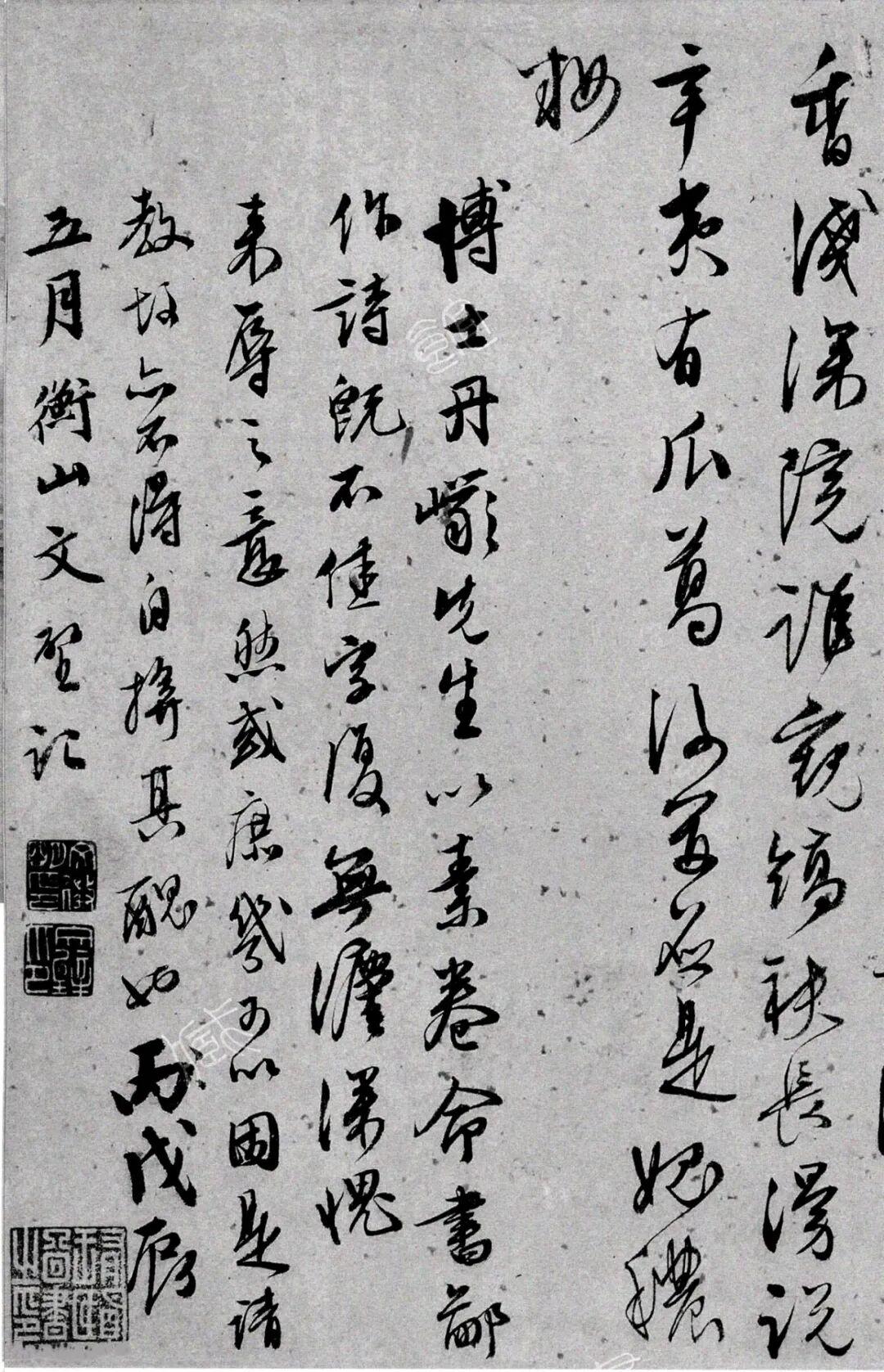 夏日雨後即事。瓦溜初乾旭日高,苔花暈壁草齊腰。一畨穠綠催朱夏,昨夜新波失斷橋。積雨情懐渾欲病,乍暄衣着最難調。西齋睡起都無事,時有幽禽破寂寥。雪夜鄭太吉遺慧泉。有客遙分第二泉,分明身在慧山前。兩年不挹松風面,百里初回雪夜船。青篛小壺冰共裹,寒燈新茗月同煎。洛陽空說曾馳傳,未必緘來味......孤根疑自木蘭堂,怪得人呼作女郎。繞砌春風憐謝傅,一天明月夢唐昌。冷魂未放清香淺,深院誰窺縞袂長。漫説辛夷有有葛,後開應是愧穠妝。博士丹巖先生以素卷命書鄙作,詩既不佳,字復無法,漫愧來辱之意。然或庶幾可以因是請教,故亦不得自揜其醜也。丙(點去)戊辰五月,衡山文壁記。