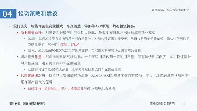过程比结局重要:产业发展过程中L2++/L3/L4带动的高ASP车型(以及对应高ASP零部件)的增长,以及Robotaxi的快速成长,将是主要投资机会。