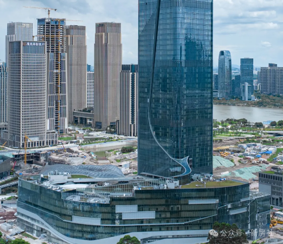 外立面采用木色陶板与全景玻璃幕墙,以“曲水流觞”的涟漪造型呼应珠江文脉,同时融入垂直生态理念,打造空中绿岛与可呼吸的建筑肌理。