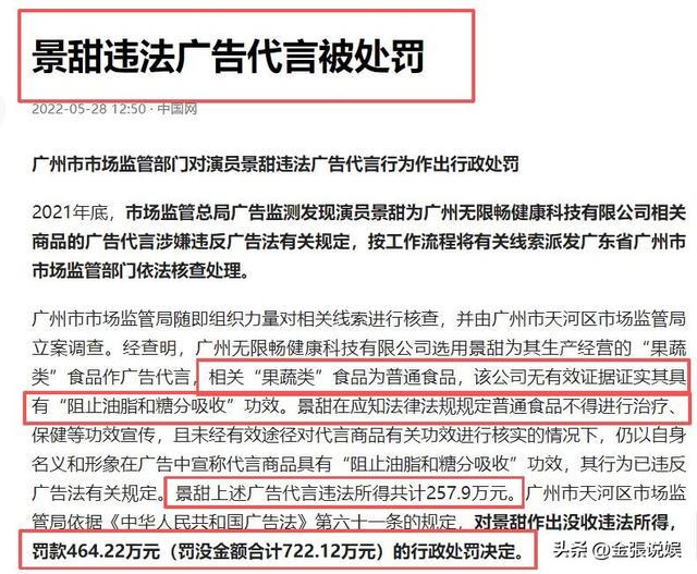 2022年,景甜因为代言一款普通糖果产品,虚假宣传保健功效,被市场监管部门重罚。