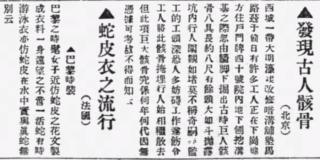 将这则报道放大,其内容确如《长狄考》一文中所述。只不过这样一则在历史学家眼中属于重要古代遗迹发现的报道,和《蛇皮衣之流行》放在了一起。以今天的眼光看,其严肃性是要大打折扣的。