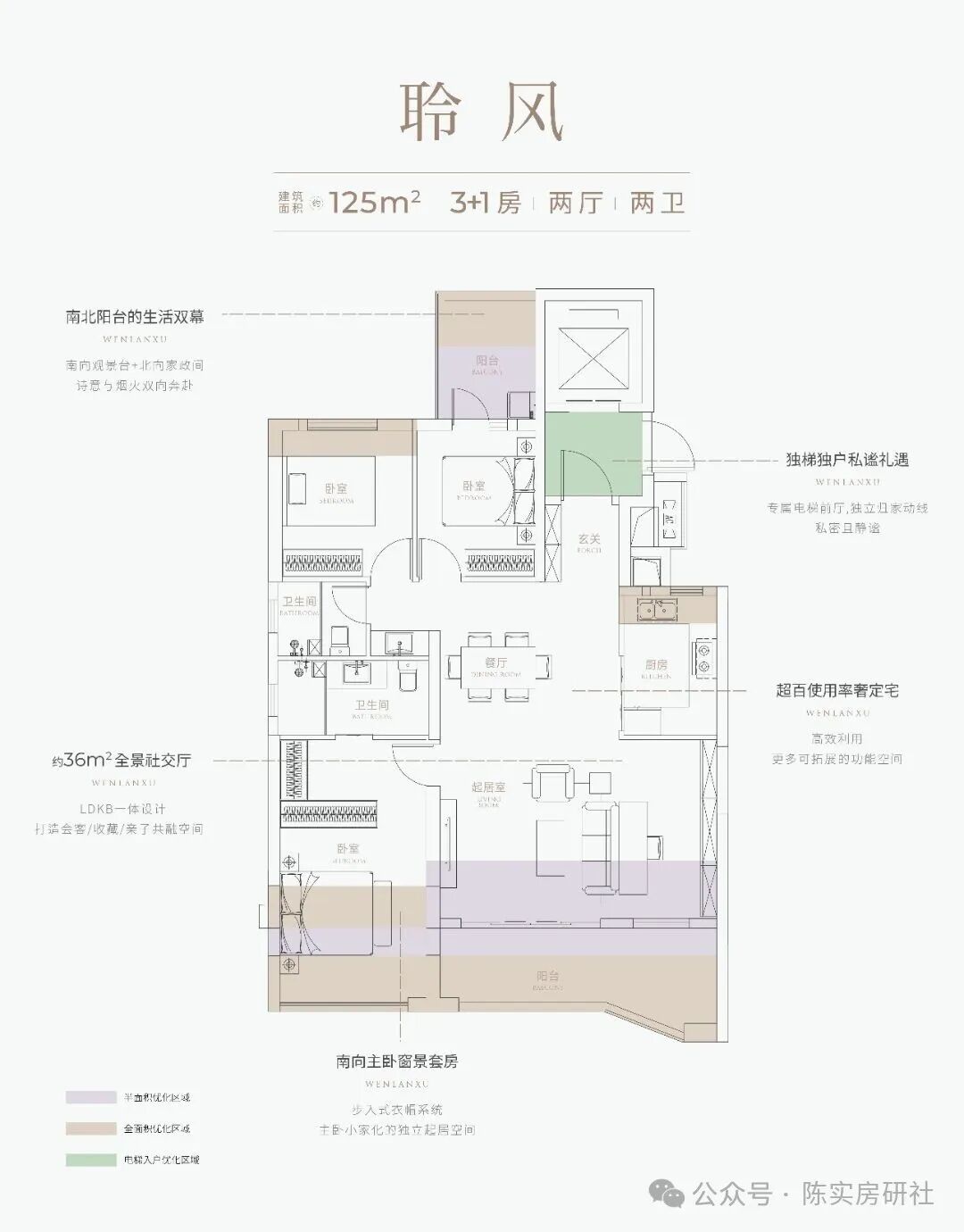 该户型位于1、2、5、6号楼的边户,独立电梯厅入户,约6.2 米横厅 + 跑道阳台:LDKB 一体化设计,客厅书房直接连通约 6.2米超大10平阳台。南北通透,带独立电梯前室,南北双阳台,除南北双阳台可优化外,阳台外面还有较大面积花池空间可优化;此外,该户型北向卧室和厨房还有飘窗优化空间。