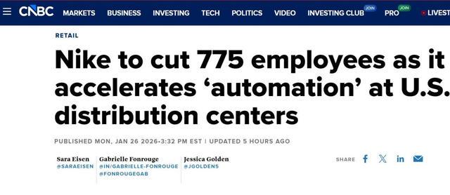 日前,CNBC援引知情人士消息披露,耐克将裁减775名员工,主要涉及其位于田纳西州和密西西比州的美国配送中心岗位。此举是公司推进供应链自动化、提升运营效率计划的一部分。