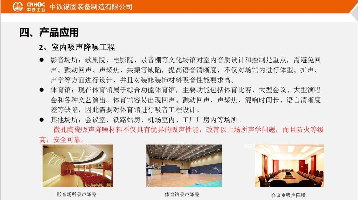 在产品应用方面,报告指出,中铁锚固的微孔陶瓷吸声降噪材料因其吸声性能优异,且强度高、耐腐蚀、抗风化、抗冻融,在室外恶劣条件应用使用寿命长,非常适用于铁路与公路声屏障、隧道涵洞、冷却塔等室外设备的噪声治理。同时,其高防火安全性和良好的声学性能,也使其在歌剧院、体育馆、会议室、铁路站房、机场、工业厂房等室内场所的声环境改善方面具有显著优势。