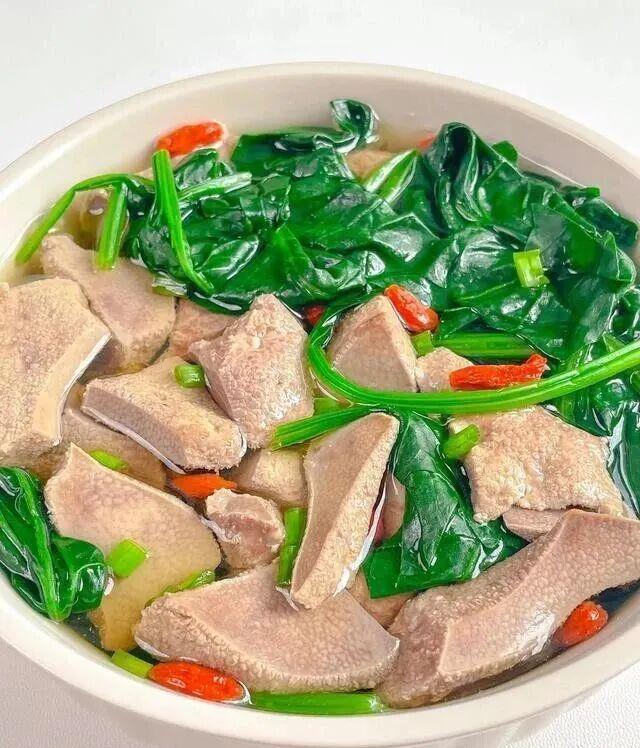 猪肝配菠菜 , 经典组合 , 猪肝一定要处理干净 , 切薄片用清水泡半小时 , 中间换两三次水 , 去腥是关键。菠菜焯一下去草酸 , 锅里水烧开 , 先下猪肝滑熟 , 再放菠菜 , 两分钟就好。
