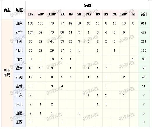 1月份上半月白羽肉鸡检测病原阳性养殖场1543个,主要检测病原包括呼吸道疾病病原:低致病性禽流感H6、H9,IB,免疫抑制剂病病原:ARV、IBDV、CAV;同时细菌性疾病病原RA、SM也有大量检出。