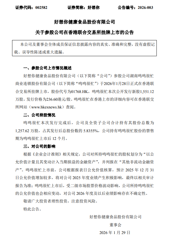 1月28日,好想你(002582.SZ)公告称,公司参股公司鸣鸣很忙(01768.HK)于2026年1月28日正式在香港联合交易所挂牌上市。公司及全资子公司合计持有其1,257.62万股,占其发行后总股份数的5.8355%。鸣鸣很忙上市前,公司预计2025年12月31日公允价值增加较多,将对公司2025年度业绩产生积极影响。上市后,公司所持鸣鸣很忙的公允价值受二级市场股票价格波动影响,对公司2026年度及以后业绩影响存在不确定性。