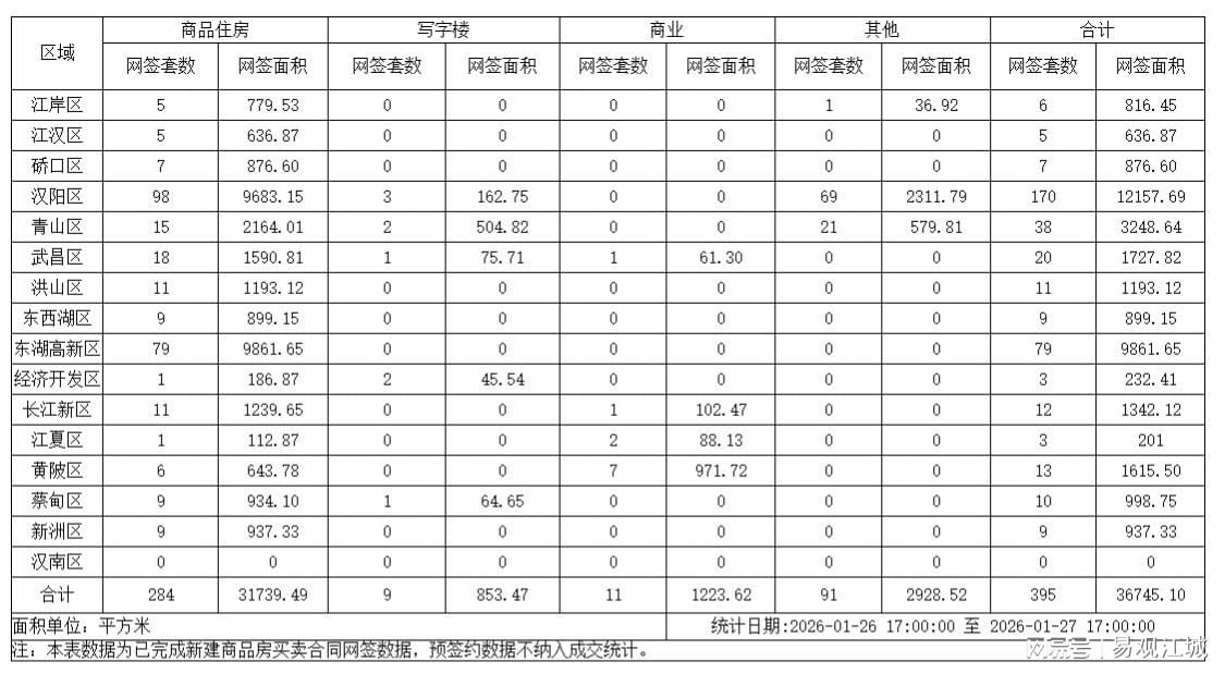 根据武汉市住房和城市更新局官网数据统计,昨日武汉新建商品房网签备案395套,网签面积达36745.1平方米。汉阳区排首位网签170套,网签面积为12157.69平方米。商品住房方面,当日网签284套,网签面积31739.49平方米;写字楼网签9套,网签面积853.47平方米;商业网签11套,网签面积1223.62平方米。
