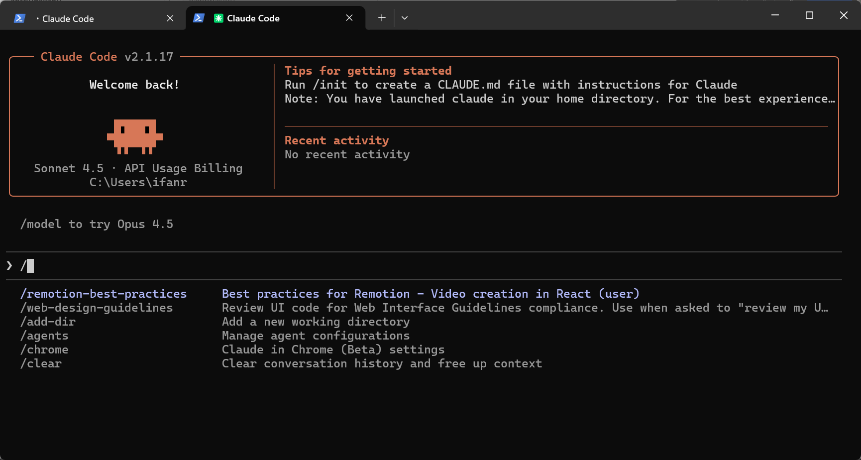 安装完成后,输入 claude,进入 Claude Code,然后斜杠 /,我们就能看到已经安装的两个 Skills,一个是 remotion-best-practices,一个是 web-design-guidelines。