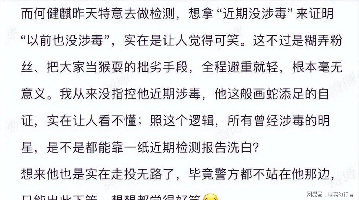 更劲爆的是,她精准说出 2021 年 10 月的具体时段,称何健麒因涉毒被北京海淀警方带走,完成尿检、血检、毛发检测全套项目。