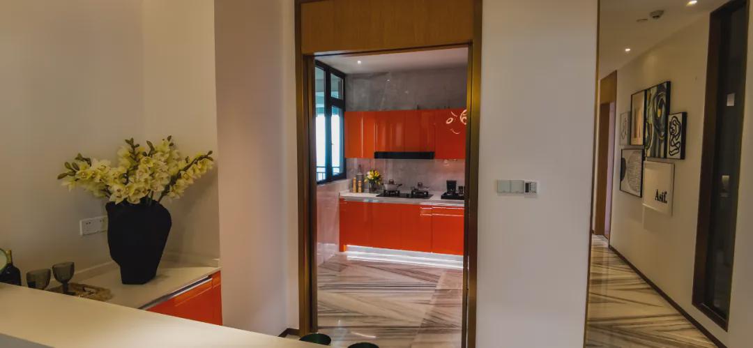 双厨房设计,一半厨房为开放式,另一半则为U型镶嵌,加起来面积不小。