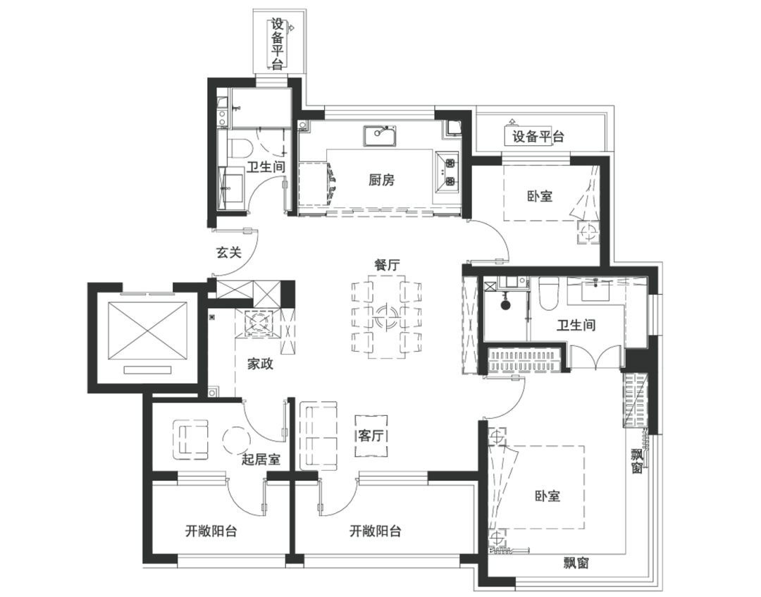 110平四居,大差不差,基本就是四叶草格局。卧室分布四角互不打扰。