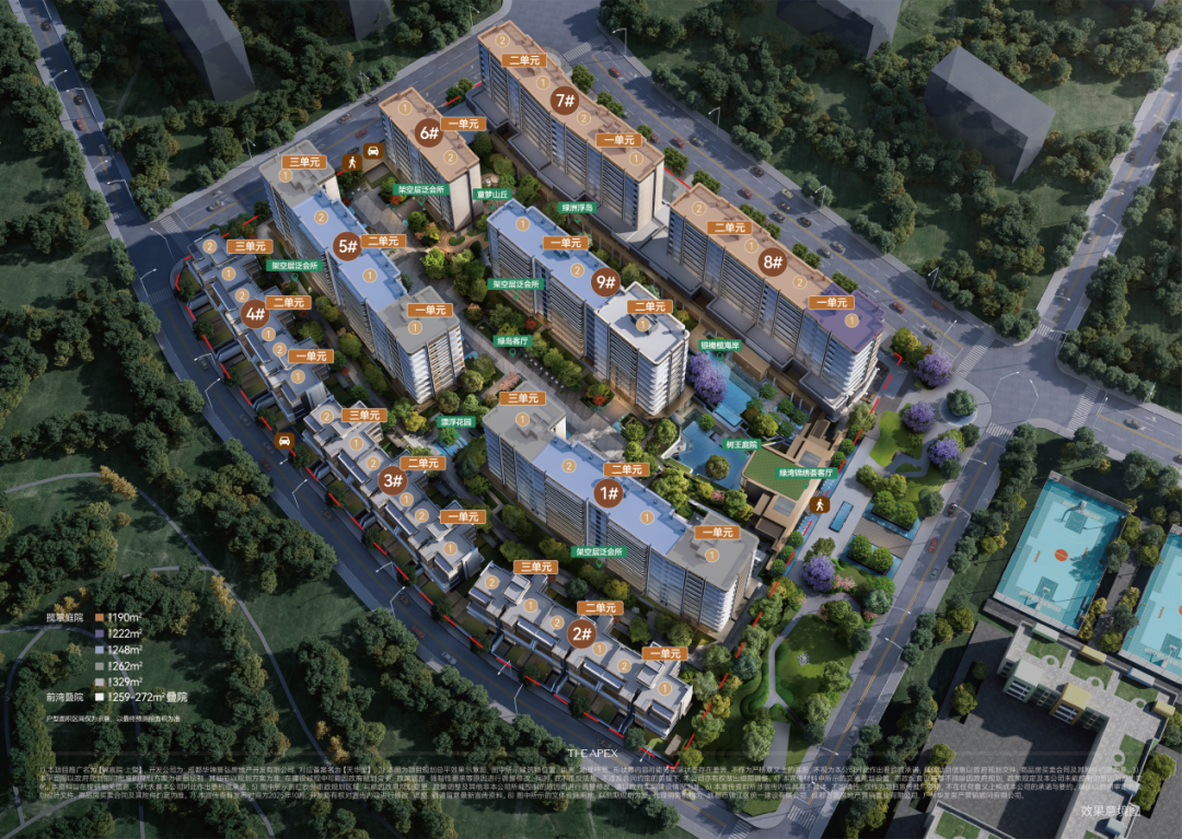 以锦宸院·上玺为例,整个项目占地约48亩,容积率约1.8,布局花园洋房和叠拼两种产品。其中6栋9-10F庭院洋房,建面约190-329㎡,采用全南北向排列+阵列式布局,视野和中庭更大化,最大中庭尺度达约83米。上下叠真叠拼仅约36套,建面约259-272㎡,直享绿湾半岛头排视野。