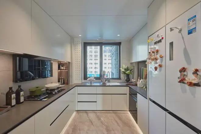 除了常规配置,还配置有双开门冰箱洗碗机,细节也很用心,手势感应灯与吊柜顶部的反光镜面设计,不管是做饭还是收纳都得心应手。