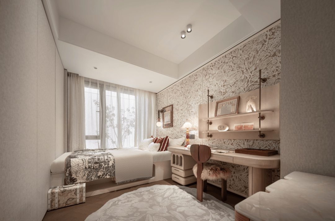 而这个北次卧不仅能放下一张完整的床,还能放下一张大尺寸的学习操作台或梳妆台,甚至还有空间做一些收纳柜和床头柜等。尺度感和实用性拉满!