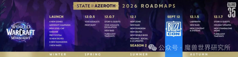 在本次艾泽拉斯状态发布会上,暴雪放出重磅消息,正式公布《魔兽世界:至暗之夜》2026年完整更新路线图,涵盖从版本上线到12.1.7补丁的全部内容,贯穿两个赛季,不仅带来了团本更新节奏的颠覆性变革,更有巨型迷宫、全新独立玩法等惊喜,堪称近几年内容最密集的一次规划,本篇文章仅大致介绍宏观的内容,具体对应每一项内容的深挖,会放在其他内容里。