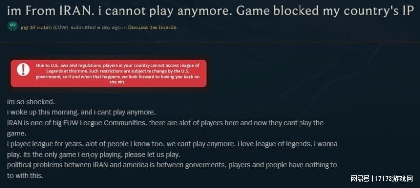 一个为人熟知的例子是《英雄联盟》。曾有一位来自伊朗的玩家,在拳头官方论坛上发帖表示,自己所在地区的IP被封禁,无法正常游玩。