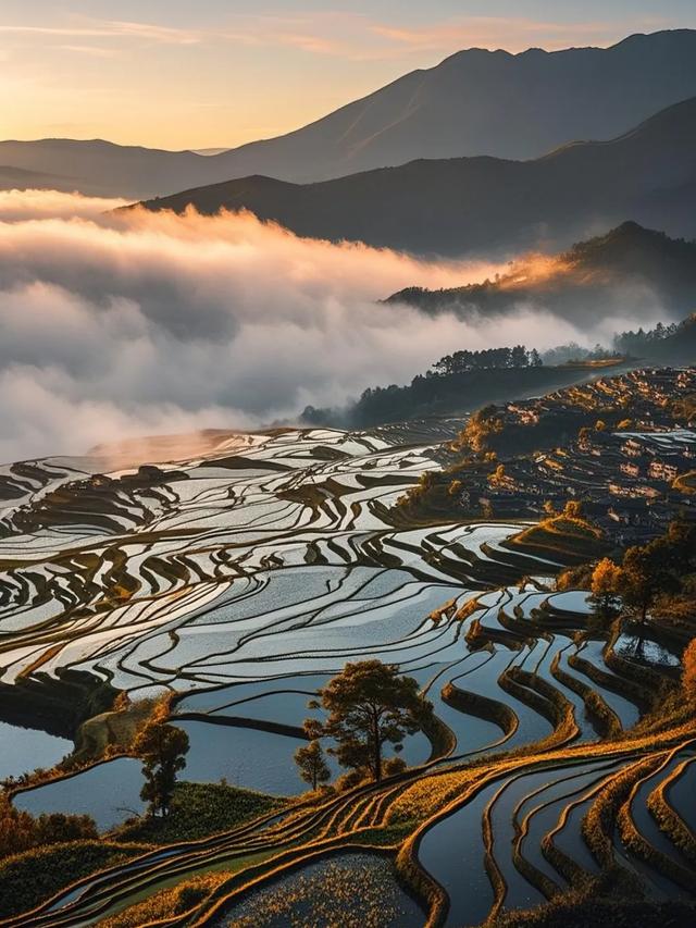 元阳有很多梯田,要说观景最好的是【多依树梯田】。它看日出晨景好地方,也是重头戏,普高老寨,彩霞、云海、梯田、村庄、晨雾,诗意和雄浑尽收眼底。