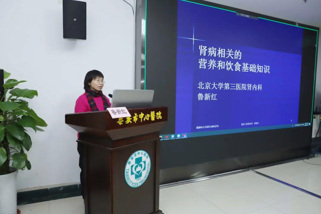 为提升肾病综合治疗中的营养支持水平,深化多学科诊疗协作,近日,泰安市中心医院特邀北京大学第三医院肾内科资深营养专家鲁新红教授来院,围绕“肾脏病患者营养管理”进行专题授课与临床指导。本次活动由医院肾病中心与临床营养科联合主办,医务部主任赵斌出席并致辞,学科建设办公室主任、消化内科中心主任、临床营养科学科带头人隋淑静主持会议,肾病中心、重症医学中心、老年医学中心、膳食科等多学科专家及临床骨干参与培训。