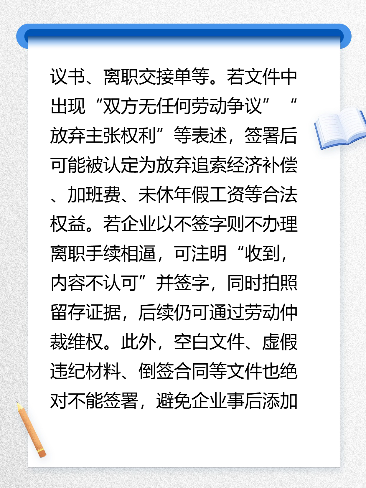 需警惕夹带“无纠纷”条款的文件,包括离职证明、解除协议书、离职交接单等。若文件中出现“双方无任何劳动争议”“放弃主张权利”等表述,签署后可能被认定为放弃追索经济补偿、加班费、未休年假工资等合法权益。若企业以不签字则不办理离职手续相逼,可注明“收到,内容不认可”并签字,同时拍照留存证据,后续仍可通过劳动仲裁维权。此外,空白文件、虚假违纪材料、倒签合同等文件也绝对不能签署,避免企业事后添加不利内容或逃避法律责任。