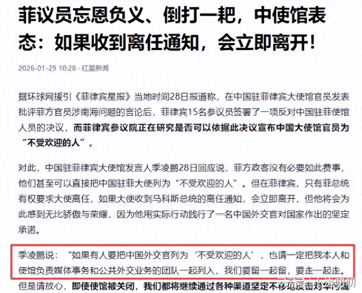 面对菲方的无理挑衅,中国驻菲大使馆的回应态度坚决,不仅明确表示如果马科斯下令驱离大使,使馆人员会立刻离开,还直言要走就一起走,这份表态既是表明中方的底线,也是展现中国外交官的骨气。