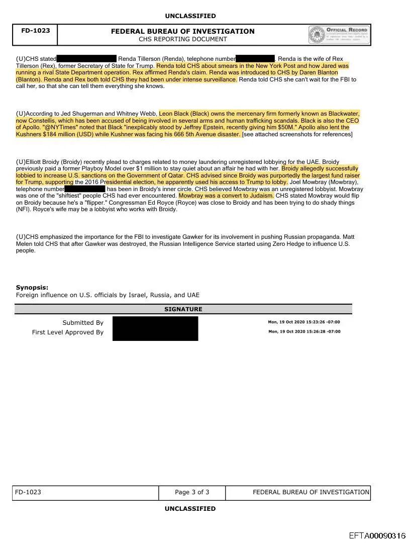 1月30日,一份此前未被公开的FBI FD-1023号文件(CHS报告)在网络上流传,该文件记录了大量关于外国势力干预、情报收买和政治渗透的指控,涉及美国精英、以色列网络、俄罗斯资本流动以及海湾国家势力。