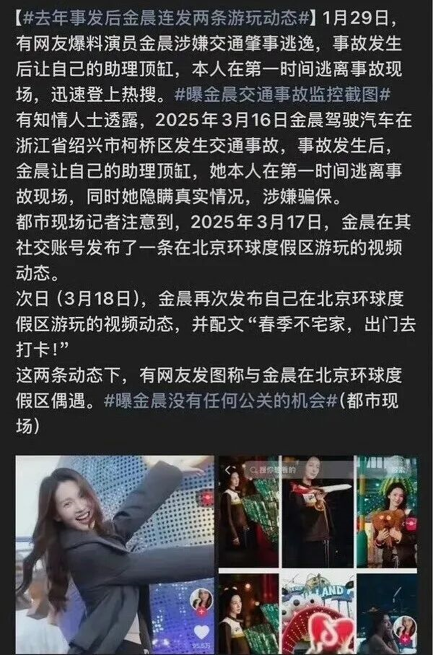 警方通报显示事故发生于2025年3月16日15时07分,按照金晨的说法,她当时因重伤急需就医,可打脸的是,3月17日和18日,金晨连续两天在社交平台发布了北京环球度假区的游玩视频,还有多位网友晒出了偶遇合照,照片中的金晨状态轻松,笑容灿烂,完全看不出任何面部重伤刚做完手术的痕迹。从绍兴到上海就医,再连夜赶到北京环球影城打卡,这时间线根本对不上。这到底是什么样的伤口,既影响到不能等待交警来处理事故,但是又不影响她大老远出去玩,真是薛定谔的伤口啊。