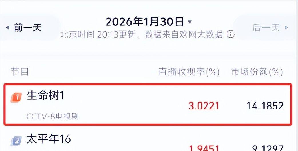 《生命树》于央视八套与爱奇艺双平台同步启播,开播31分钟,CSM全国网实时收视率即跃升至2.08;灯塔专业版数据显示,首播日最高实时收视峰值达3.12,稳居当日全频道榜首。