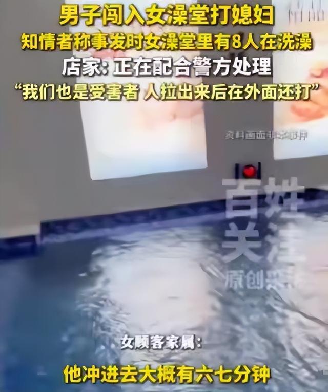 里面当时有8个女的正在洗澡,有的刚脱完衣服,有的正搓背,都光着身子。那个男的进来就找他老婆,没说两句话就动手打。旁边人吓懵了,没人敢上前拉架。一个工作人员想拦,被他一把推倒在地上。从进门到被拖出去,总共差不多5分钟。
