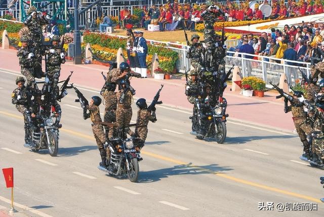 印度阅兵的“奇特”早已闻名全球,外界提起它,最先想到的就是亢奋夸张的人员方队、粗制滥造的装备模型,还有压轴的摩托车表演——一辆车就能承载一个班的士兵。