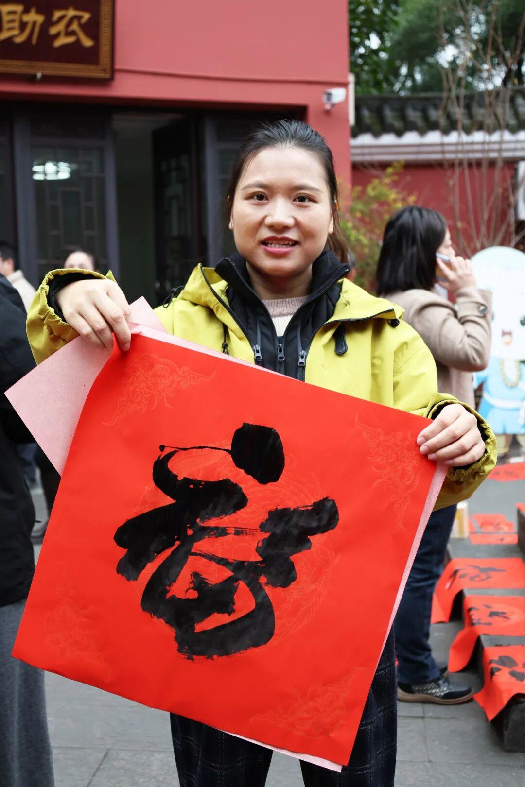 红纸铺开,墨香四溢。活动现场,道坚大和尚领众法师挥毫泼墨,笔走龙蛇间,一个个饱满的“福”字跃然纸上,每一笔都承载着文化的传承和对新年的美好祈愿。