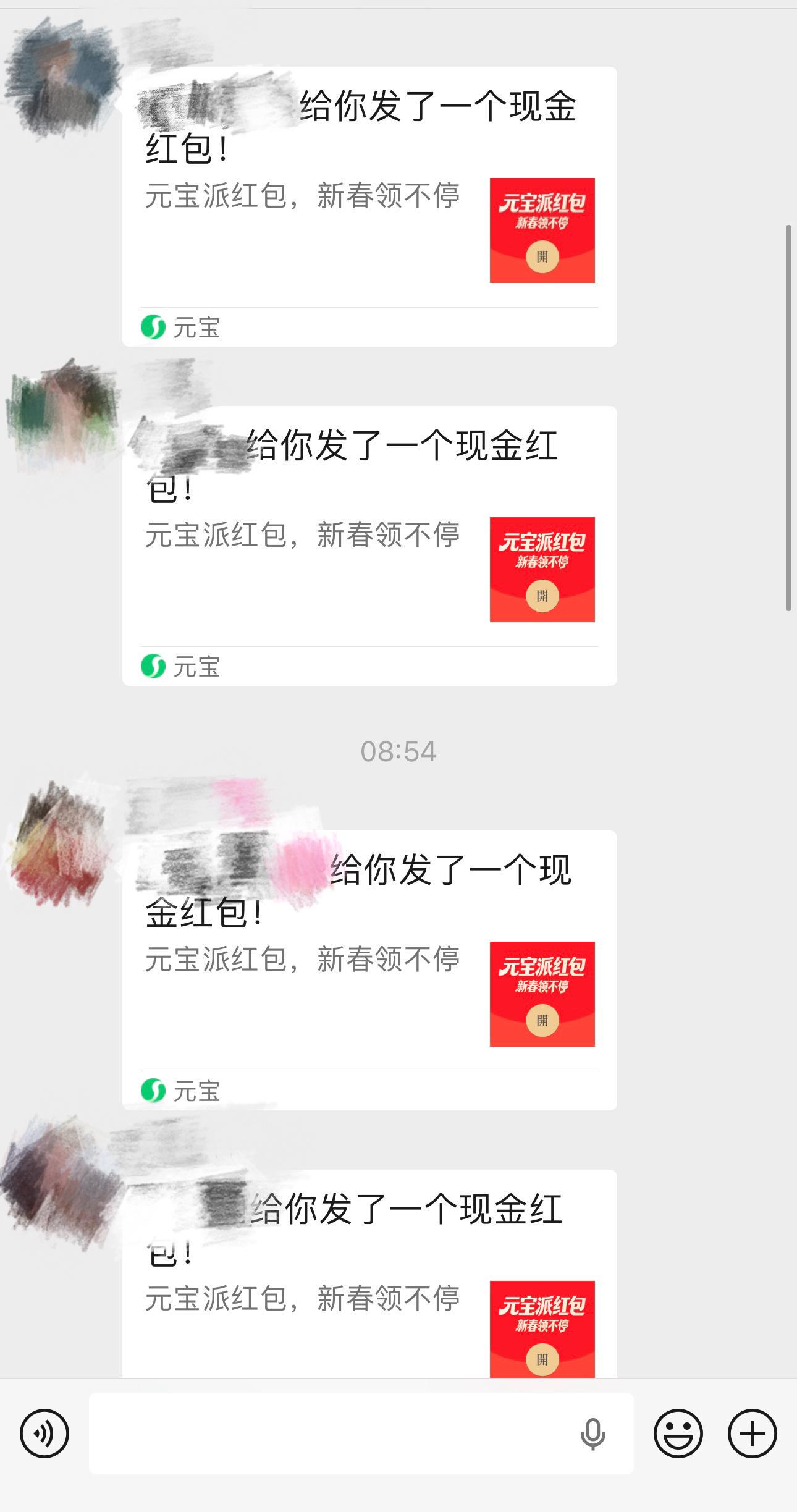 今日一早,《科创板日报》记者也发现,微信多个群聊被同一内容刷屏。点开对话框,几乎不见日常对话,满屏皆是“元宝红包”的分享链接。这一景象,仿佛将时间拉回到了2015年春节微信凭借“摇一摇”红包引爆全民互动的盛况。