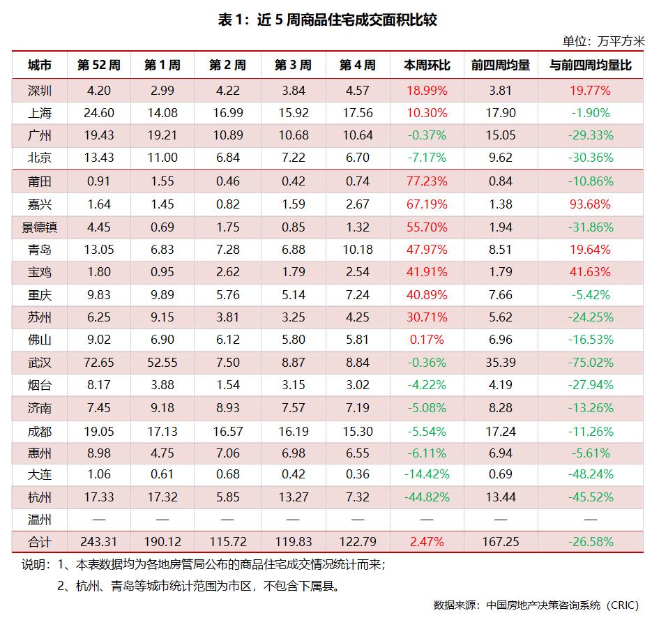 本期要点商品住宅:本周监测的二十座典型城市商品住宅成交总面积122.79万平方米,环比增加2.47%。