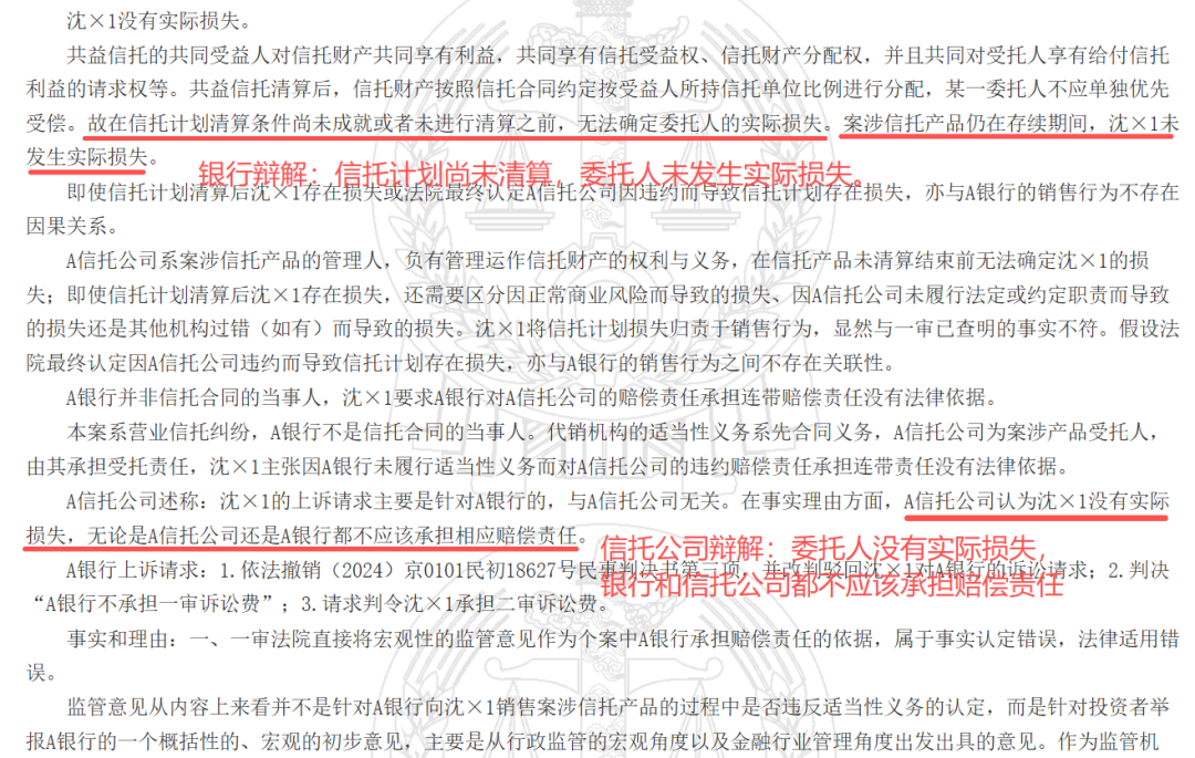 司法实践中,部分金融机构以“信托计划未清算、实际损失无法确定”为由拒绝承担赔偿责任,本案判决对此作出了明确回应:信托公司与代销银行的赔偿责任,可基于违约及过错行为单独认定,无需以信托计划完成清算为前置条件。