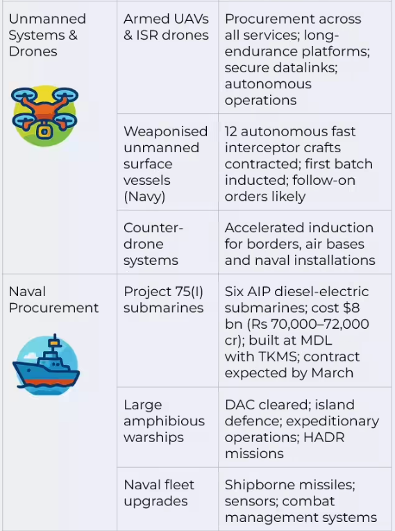 在国防采购委员会批准了价值约7900亿卢比的采购提案后,印度的海上和远征能力将得到扩展。这些提案包括大型两栖战舰、登陆平台船坞、舰炮和支援舰,以及反坦克导弹、高机动性车辆和远程无人机。现代化路线图还优先考虑为陆军和空军采购156架“普拉昌德”轻型战斗直升机,该机专为高海拔作战设计,国产化率超过65%。同时,武装无人机、监视无人机和反无人机系统的引进也将扩大。此外,还包括一些规模较小但至关重要的交易,例如为陆军采购42.5万支卡宾枪和为海军采购48枚重型“黑鲨”鱼雷,旨在弥补前线能力差距。