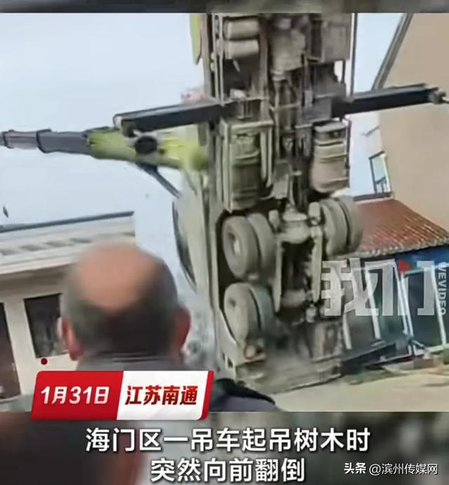 据媒体报道,1月31日,江苏南通海门区一吊车起吊树木时,突然向前翻倒,车身直接被翻成直角。
