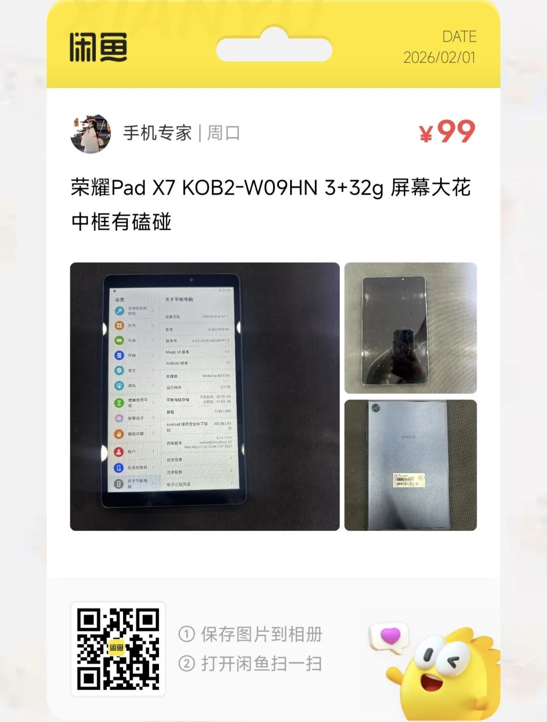 粉丝爆料分享了一台价格99元的荣耀Pad X7 KOB2-W09HN 3+32g 屏幕大花