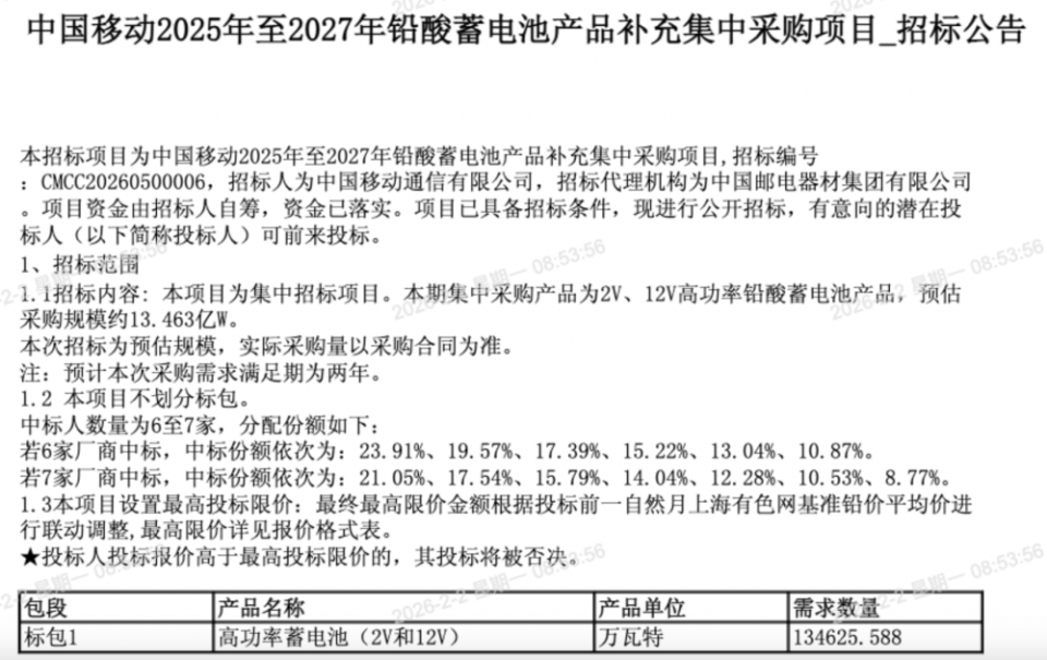 C114讯 2月2日消息(九九)中国移动采购与招标网日前发布2025年至2027年铅酸蓄电池产品补充集中采购项目招标公告,集中采购2V、12V高功率铅酸蓄电池产品,预估采购规模约13.463亿W。预计本次采购需求满足期为两年。