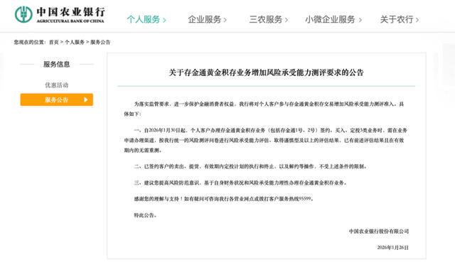 1月26日,农业银行发布公告称,自1月30日起,个人客户办理存金通黄金积存业务(包括存金通1号、2号)签约、买入、定投3类业务时,需在业务申请办理渠道,按该行统一的风险测评问卷进行风险承受能力评估、取得谨慎型及以上的评估结果。