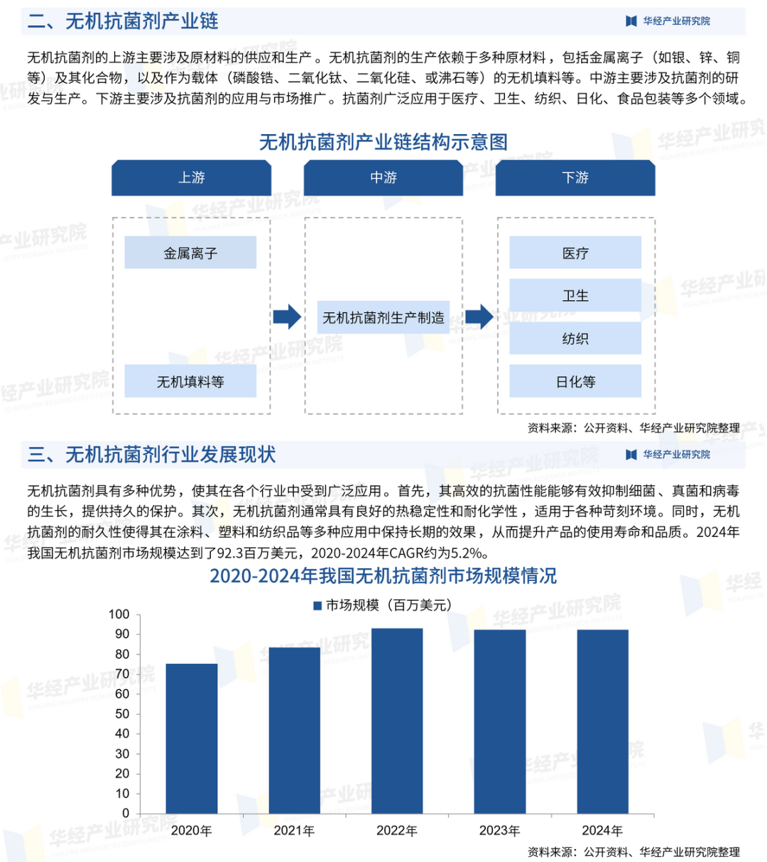 无机抗菌剂具有多种优势,使其在各个行业中受到广泛应用。首先,其高效的抗菌性能能够有效抑制细菌、真菌和病毒的生长,提供持久的保护。其次,无机抗菌剂通常具有良好的热稳定性和耐化学性,适用于各种苛刻环境。同时,无机抗菌剂的耐久性使得其在涂料、塑料和纺织品等多种应用中保持长期的效果,从而提升产品的使用寿命和品质。2024年我国无机抗菌剂市场规模达到了92.3百万美元,2020-2024年CAGR约为5.2%。