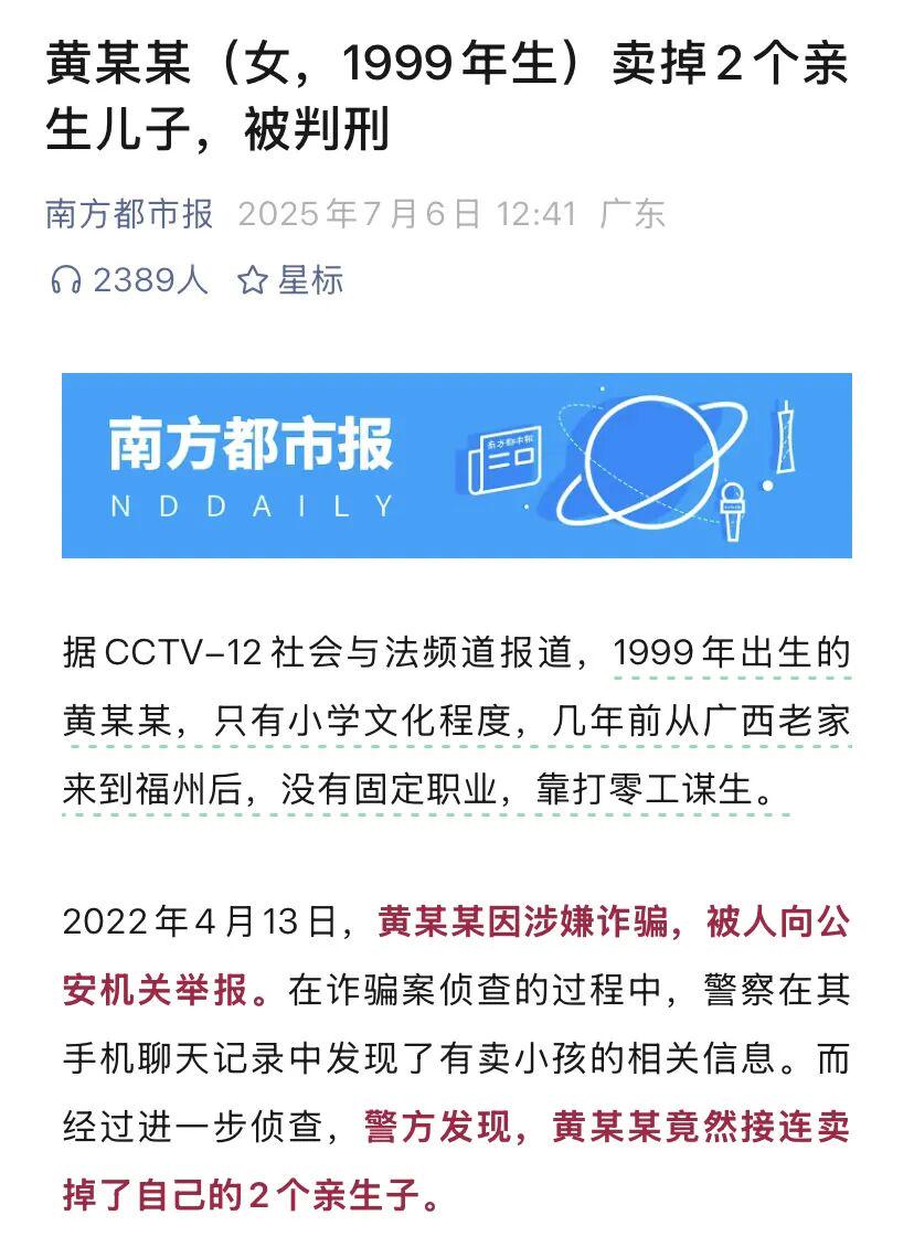 比如2022年发生的真实案例,23岁的黄某某亲手卖掉了自己的2个亲生儿子。