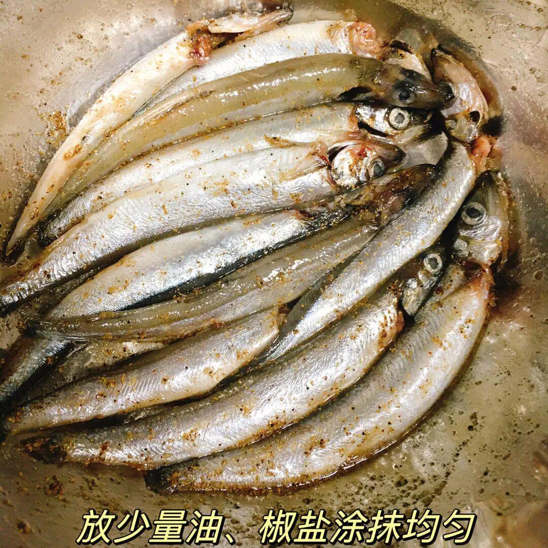 2. 多春鱼冲洗干净,放少量油、椒盐涂抹均匀。油不要放太多,多春鱼本来就是湿的,油多了,口感会湿漉漉的、不香脆。