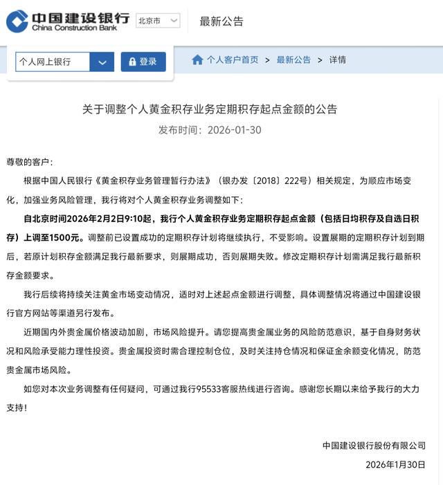 工行则从2月7日开始,非交易日对如意金的积存、赎回设限额,金额动态调整,提金业务不受波及。此次调整是银行应对黄金市场波动、加强风险管控的举措,对想低门槛攒黄金的新手不太友好,大家入手前要算好资金,老用户续期定投记得核对金额是否达标。