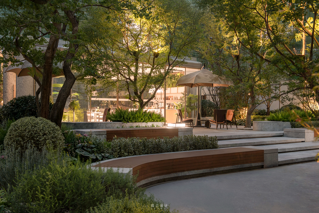 我们在连廊转折处营造了一个都市里闹中取静的轻奢庭院,暮色下的氛围松弛又雅致,水景中柔光的喷泉溅起细碎水花,波光与灯光交织出灵动温柔,整个空间藏着能让人慢下来的松弛感,像都市生活里一处疗愈的小秘境。