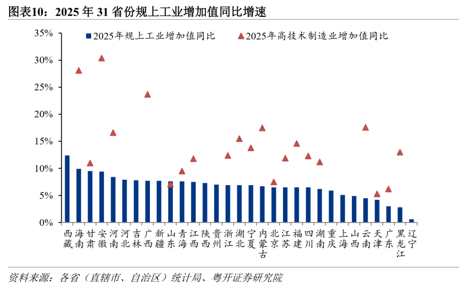 五、产业结构:工业发挥“压舱石”作用,服务业亮点增多从工业看,中西部省份工业增加值增速较快,东部聚焦质效提升,东北转型阵痛犹存。2025年,全国31个省份规上工业增加值均实现正增长。扣除价格因素影响,工业生产对经济增长的贡献继续提升,工业经济发展发挥“压舱石”作用。其一,西部省份加快“新型工业化”,资源优势加快向产业优势转化。西藏积极发展资源加工业、清洁能源开发等特色产业,2025年规上工业增加值同比增长12.4%,连续两年位居全国第一。甘肃得益于新能源产业驱动工业金属需求以及重点行业“反内卷”显效,黄金、精炼铜、白银产量分别增长42.2%、16.9%、9.7%,有色金属冶炼行业增加值增长19.5%,高于全国12.7个百分点;2025年甘肃规模以上工业增加值增长9.5%,增速连续四年高于全国。其二,中部省份工业升级和产业转移特征显著,增速快于全国。2025年,中部地区中,安徽、河南、江西、湖北、湖南规上工业增加值分别增长9.4%、8.4%、7.5%、6.9%、6.2%,增速均跑赢全国,工业成为中部地区经济增长压舱石。安徽受益于长三角产业链延伸,2025年规上工业增加值增速位居全国第四、长三角及中部第一,高技术制造业增加值同比高增30.4%;安徽新能源汽车产量增长1.4倍,成为“汽车产量第一大省”,汽车制造业成为工业增长的最大贡献来源。河南发挥物流枢纽优势,电子、汽车、装备制造三大主导产业增加值合计同比增长11.9%,拉动全省规上工业增加值增长5.6个百分点。其三,东部省份推进制造业高端化、智能化,工业经济新旧动能转换深入,高技术制造业贡献提升。2025年,广东、江苏、浙江、福建高技术制造业增加值同比6.2%、7.5%、12.4%、14.6%,均高于其他工业行业增速。山东推进工业经济“头号工程”,装备制造业增加值同比增长11.4%。江苏装备制造业增加值同比增长8.8%,对全部规上工业增长的贡献率达74.6%。浙江提升数字经济优势,数字经济核心产业制造业增长12.4%。广东面临产业结构调整和产业外迁压力,2025年广东规上工业增加值同比增速放缓至3.0%,低于全国2.2个百分点;但广东战略性新兴产业蓬勃发展,民用无人机、工业机器人、新能源汽车等产品产量放量增长。海南全省规上工业增加值增长9.9%,增速位列全国第二,主要得益于自贸港加工增值免关税政策吸引芯片设计制造等一批高端制造项目落地,带动电子信息制造业高增长。其四,东北地区内部“落差显著”,工业仍处于转型攻坚期。吉林依托汽车、装备制造强势推动工业复苏,同时发展医药产业培育新增长点,规上工业增加值增长7.8%;而辽宁受传统重化工业拖累严重,汽车、石化、建材工业转型阵痛明显,规上工业增加值增速排名全国垫底。