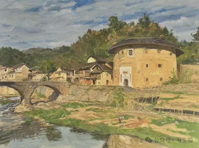 他的技法带着写生独有的鲜活与克制,不刻意雕琢轮廓,却能精准捕捉光影落在物象上的微妙变化,晨光漫过瓦檐的暖调,溪水映着云影的清透,风沙掠过古迹的粗粝,都在布面之上自然铺展。油彩的厚薄交织出自然的肌理,浓淡相宜的色彩晕染出空间的纵深感,没有华丽的技法堆砌,平实中自有深厚功力。这种创作方式,恰如东方美学中“清水出芙蓉,天然去雕饰”的境界,他以画笔为媒介,让山川草木的本真质感自然流露,既保留了实景的真实温度,又赋予画面诗意的升华。