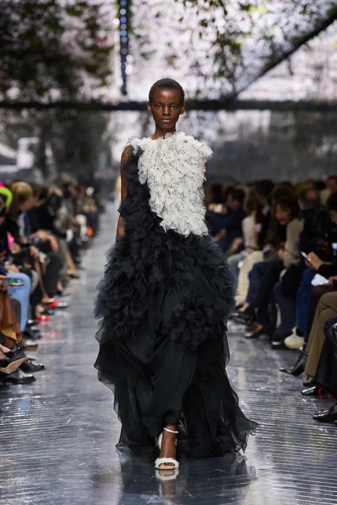从镂空针织礼服裙到结构精妙的羊绒针织衫,Anderson证明即便是富有日常感的面料,也能在顶级工艺中展现高定的尊严。“针织在高订中大有可为,”他表示,“尤其是当纱线与编织同步完成之时”。