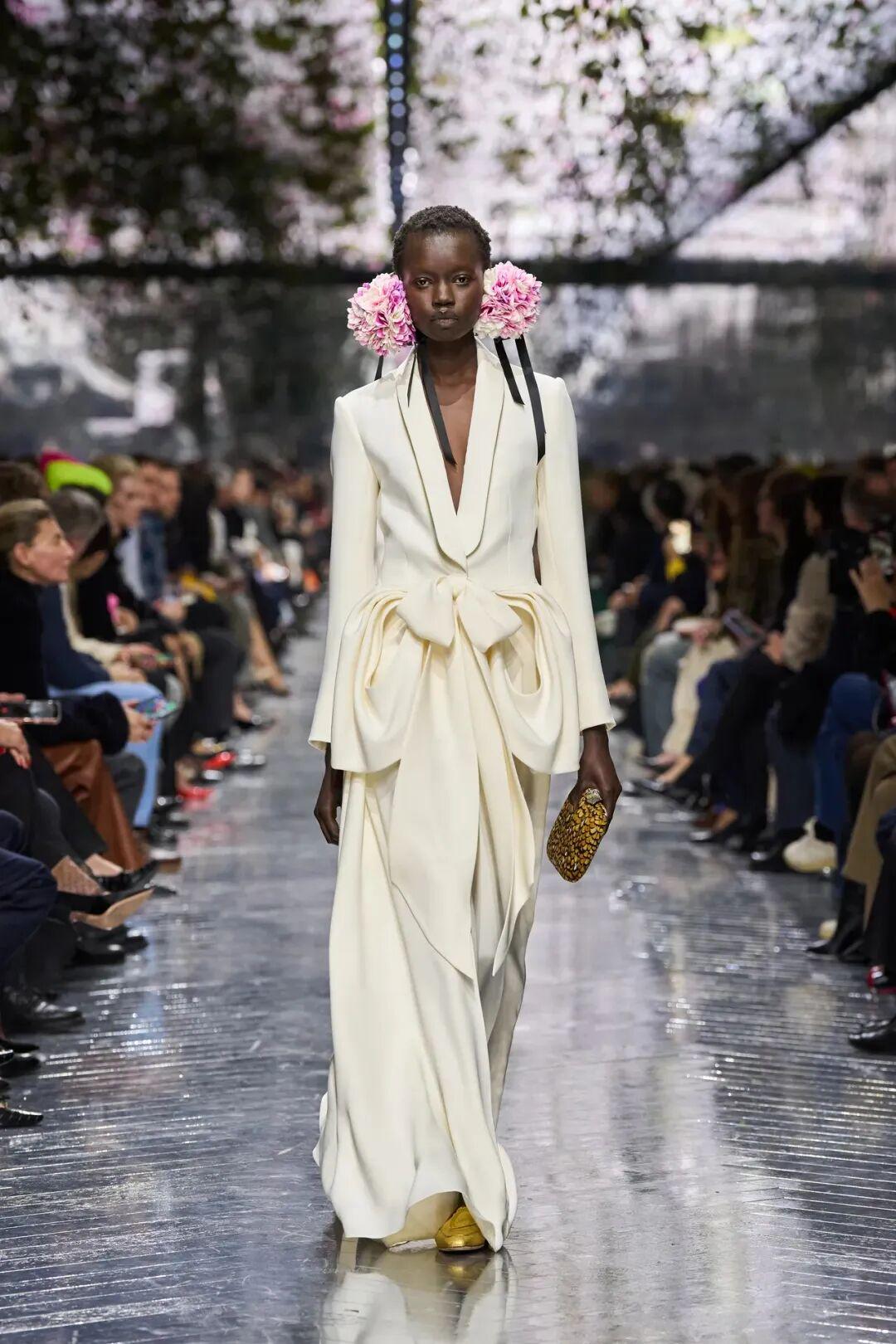 Dior经典的Bar Jacket在本季被拆解重塑,幻化出数十种截然不同的表达——从鳄鱼皮高腰大衣到蝴蝶结饰花型下摆西装,Anderson既尊重传统,又大胆创新。